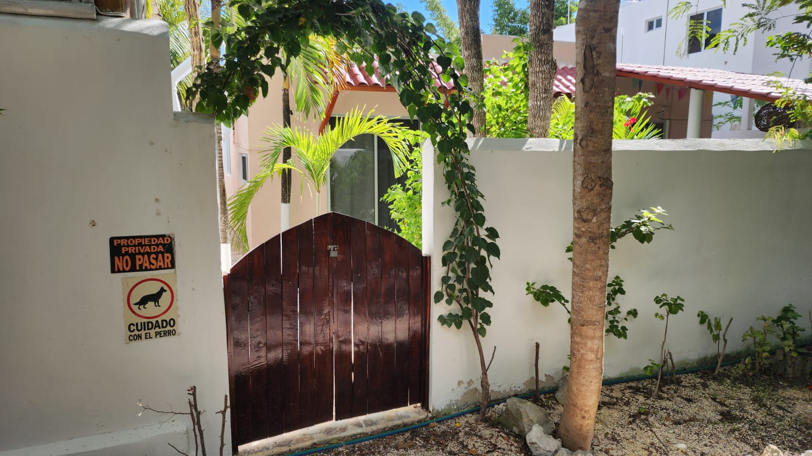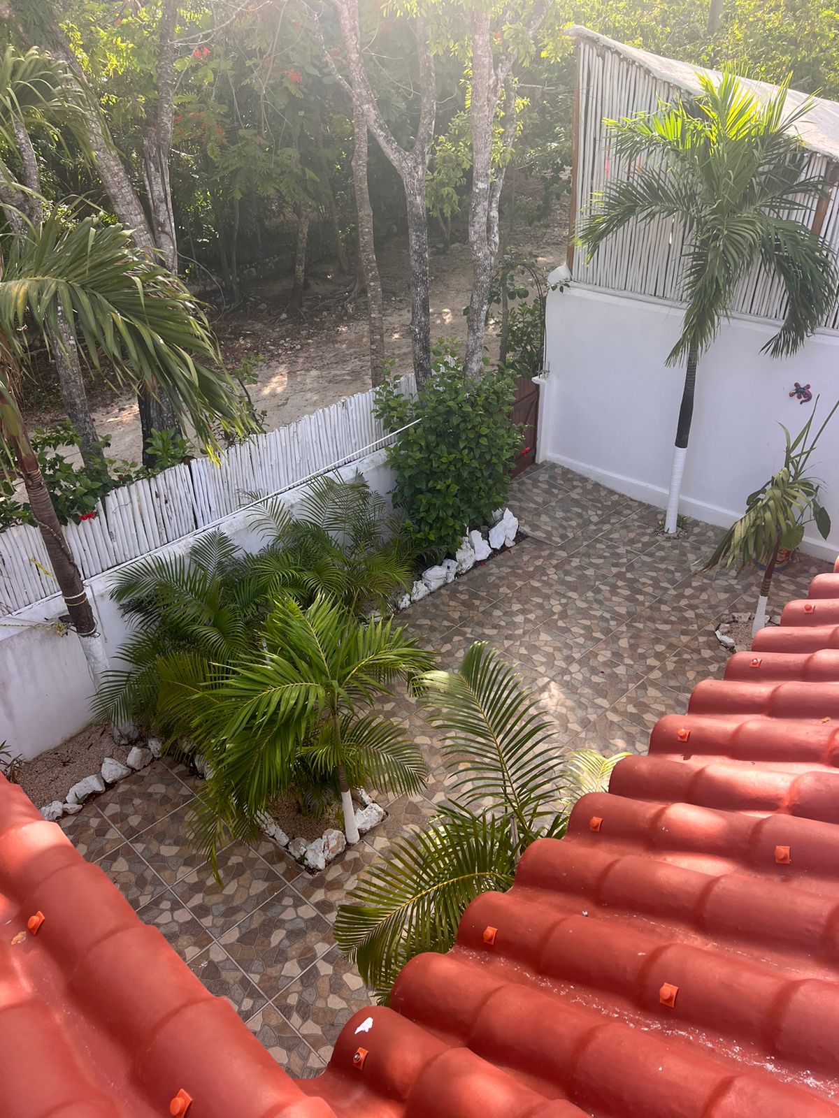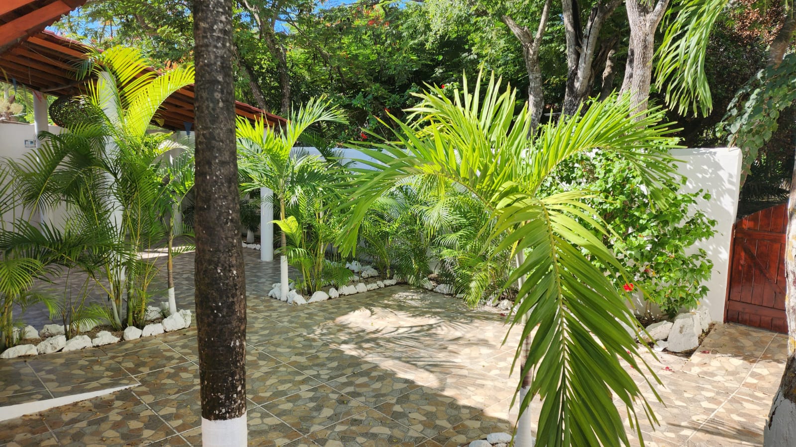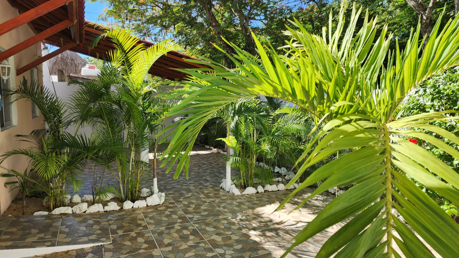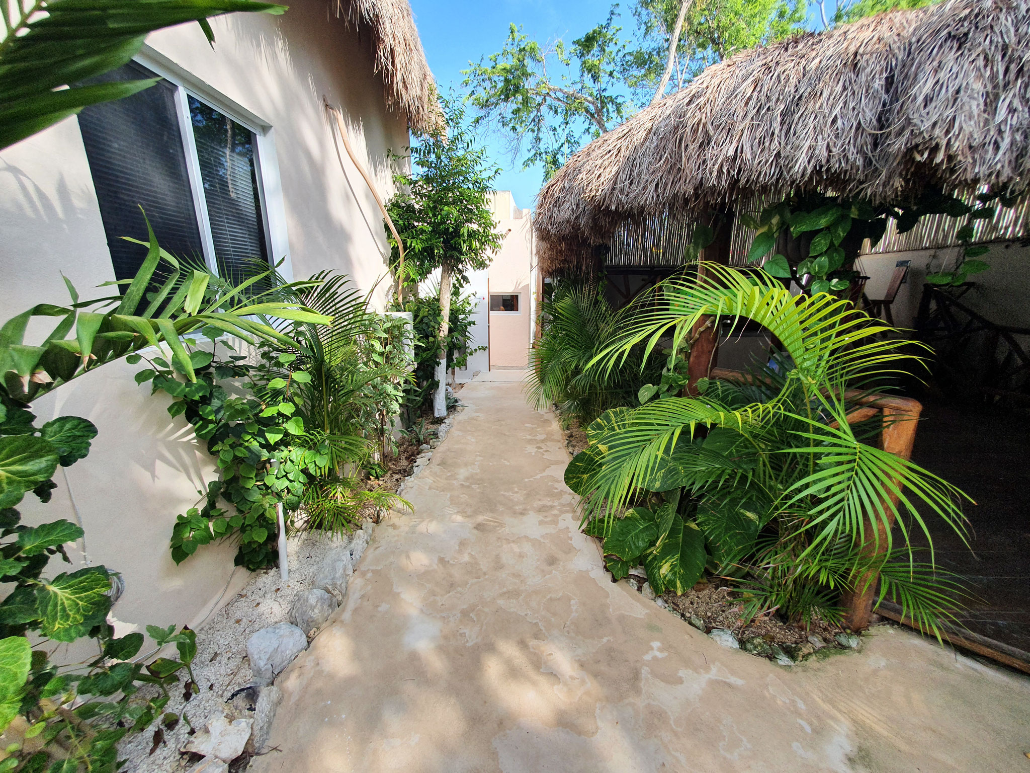 Die beiden privaten Palapa-Häuser mit rustikalem Strohdach im typisch karibischen Stil sowie das Studio-Apartment im 1. Stock und auch die Garten-Apartments liegen ruhig, inmitten auf einem privaten und abgeschlossenen Wohngebiet mit Einzelhäusern und Apartments. Viele kleine Sand-Schotterwege durch den Dschungel laden zum Spazieren gehen oder Sport treiben ein. Hier kann man ab und zu sogar kleine Äffchen, Papageien, karibische Vögel und Leguane beobachten