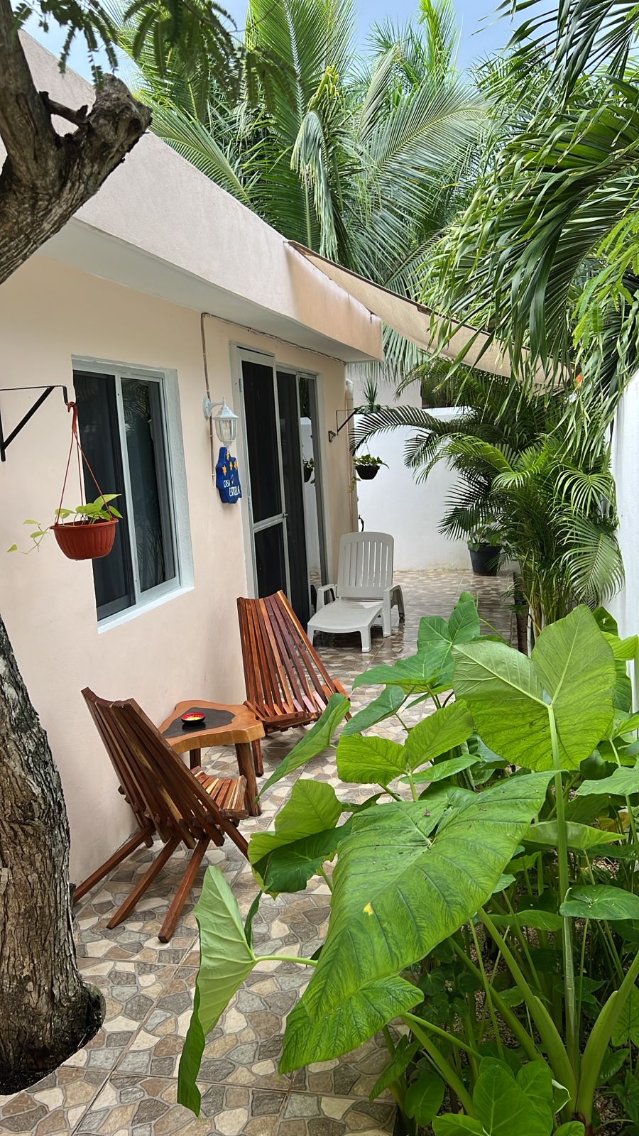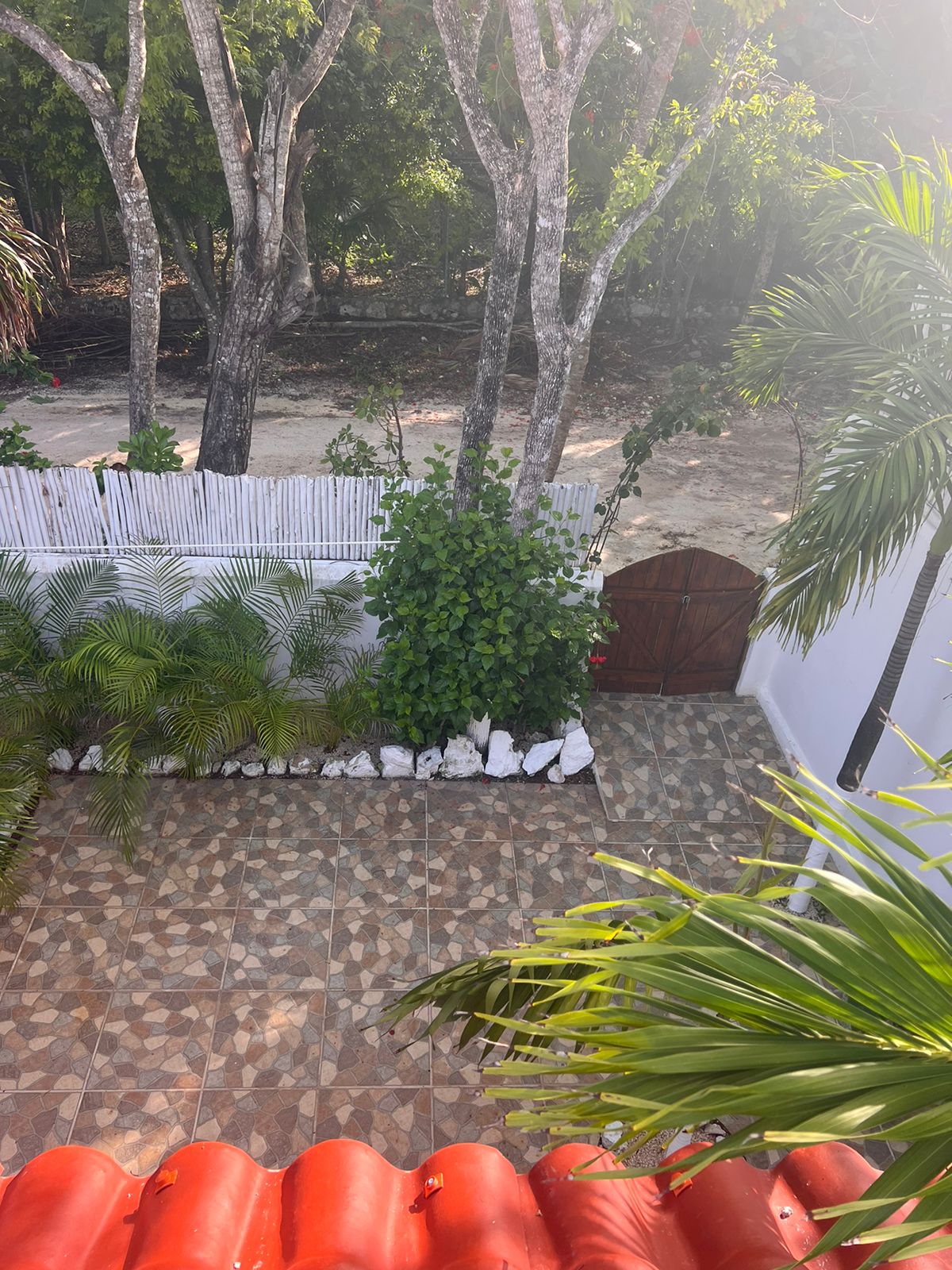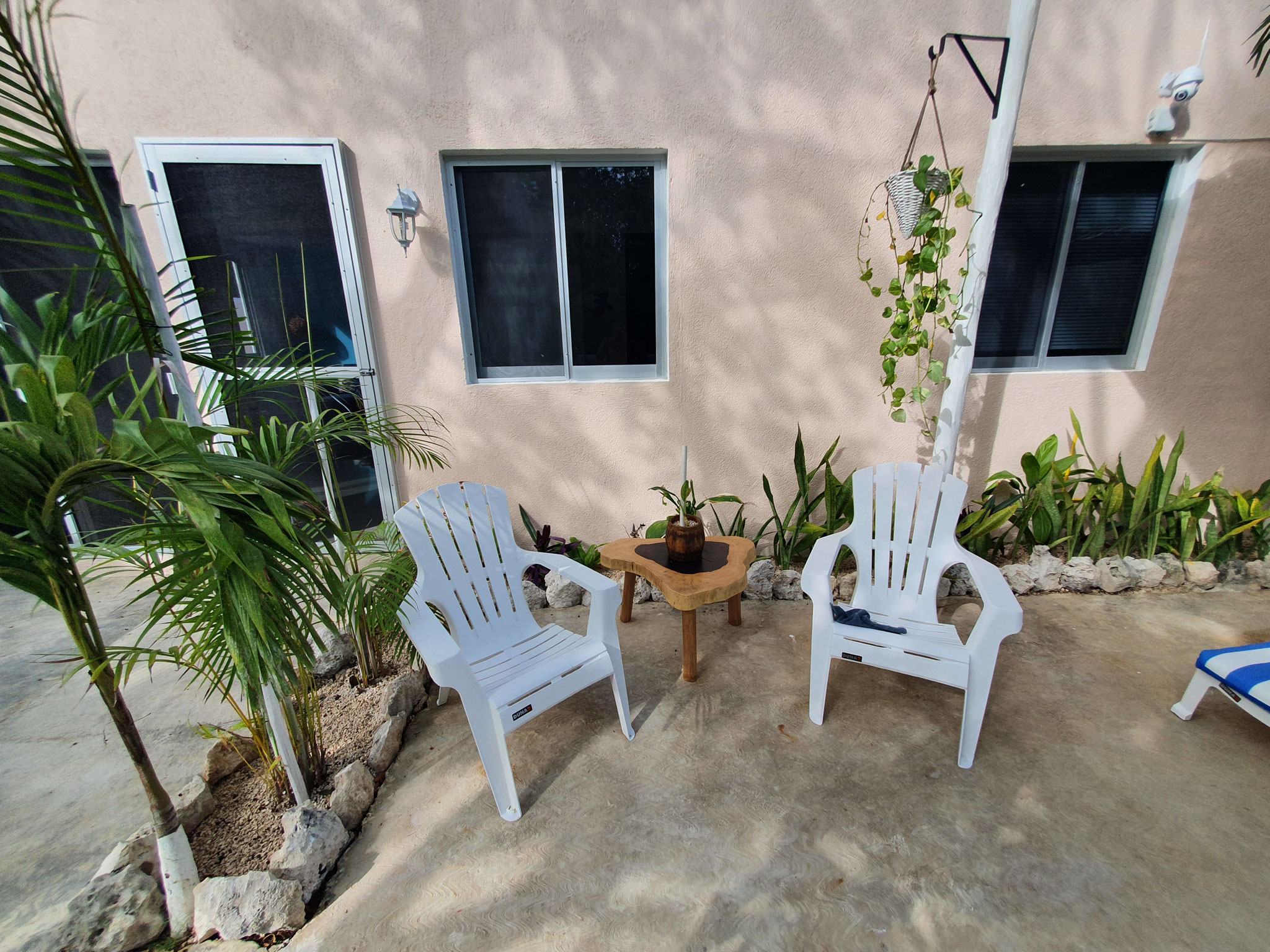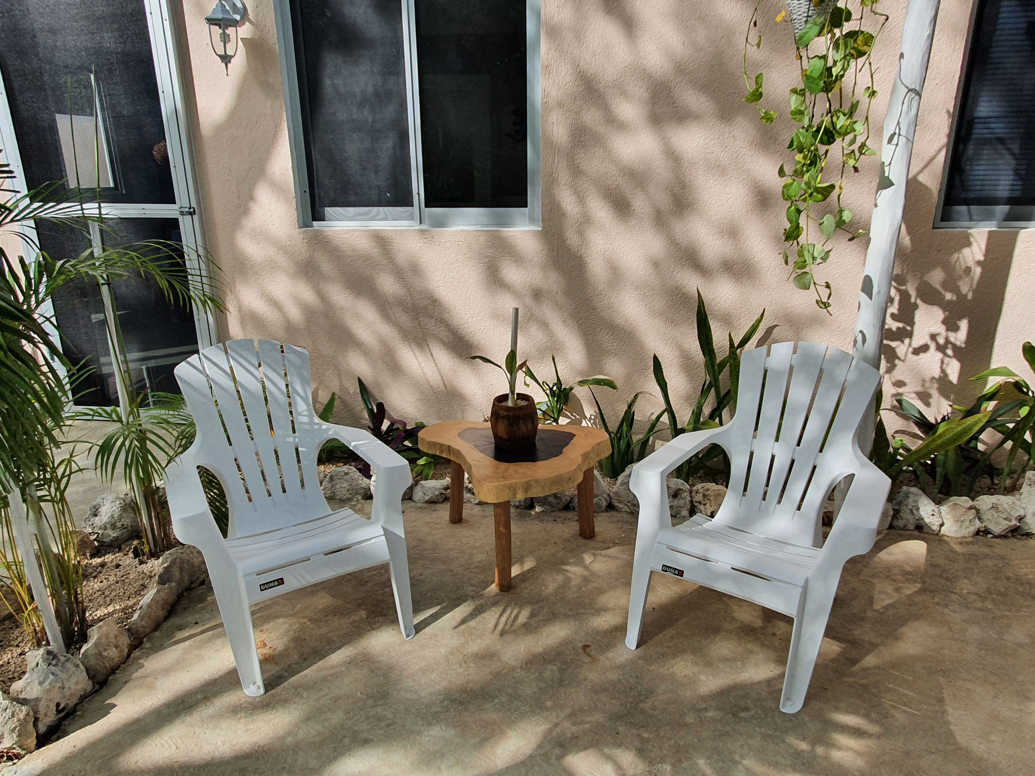 Die beiden privaten Palapa-Häuser mit rustikalem Strohdach im typisch karibischen Stil sowie das Studio-Apartment im 1. Stock und auch die Garten-Apartments liegen ruhig, inmitten auf einem privaten und abgeschlossenen Wohngebiet mit Einzelhäusern und Apartments. Viele kleine Sand-Schotterwege durch den Dschungel laden zum Spazieren gehen oder Sport treiben ein. Hier kann man ab und zu sogar kleine Äffchen, Papageien, karibische Vögel und Leguane beobachten