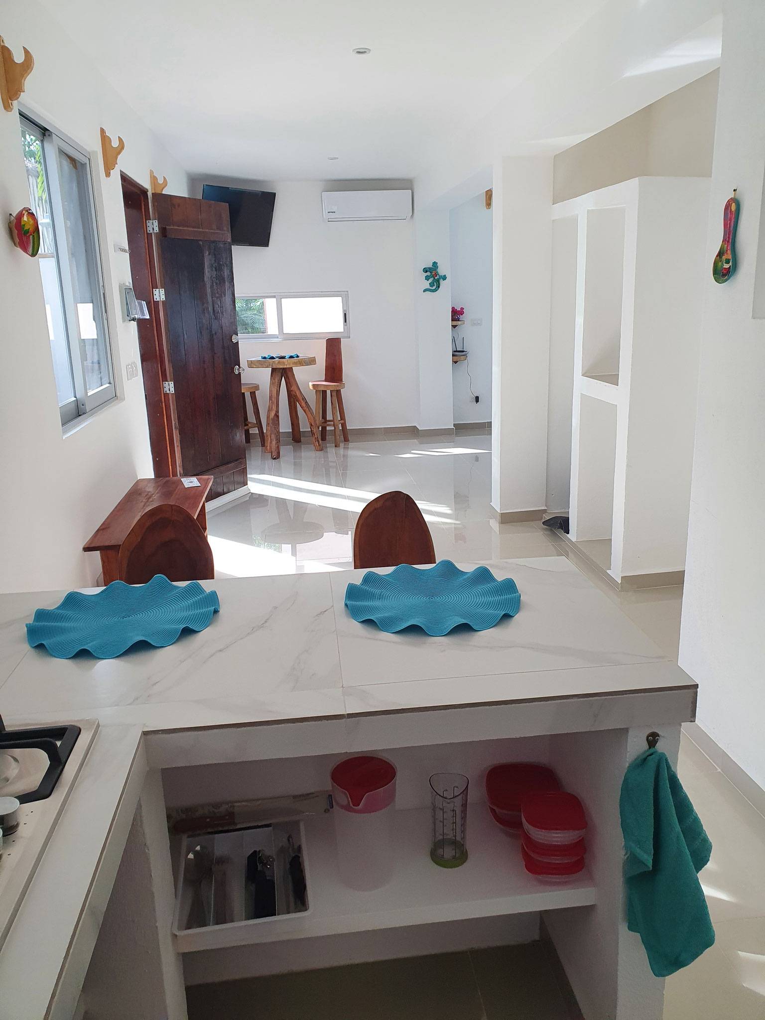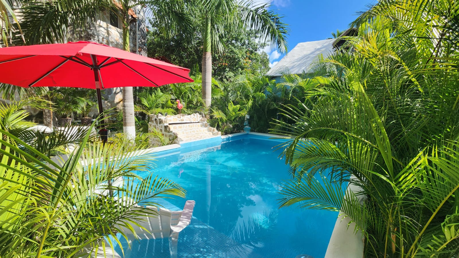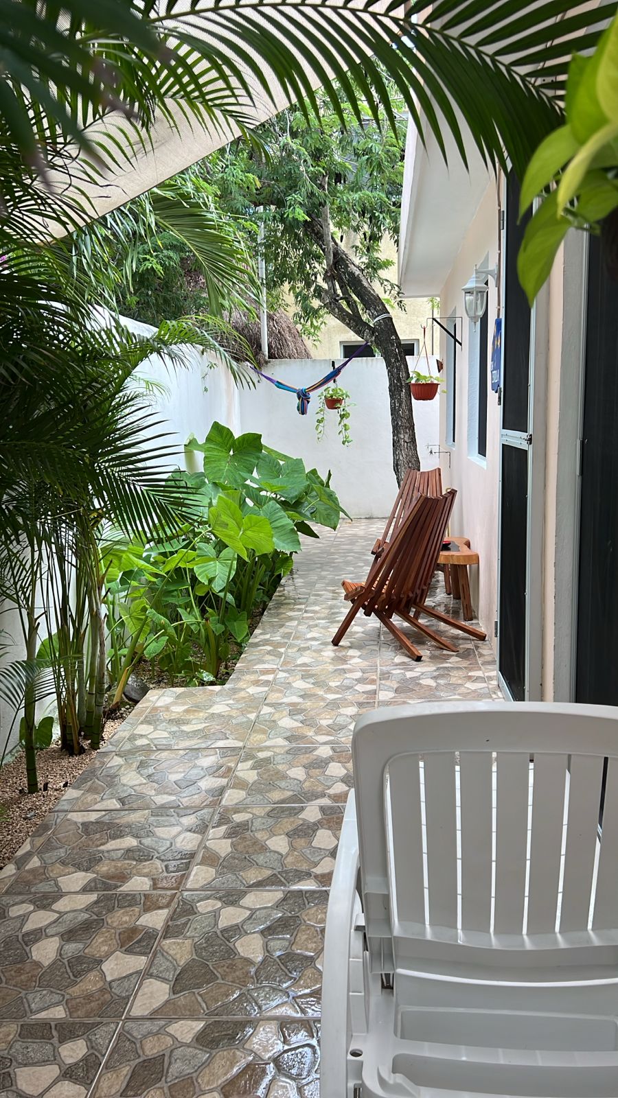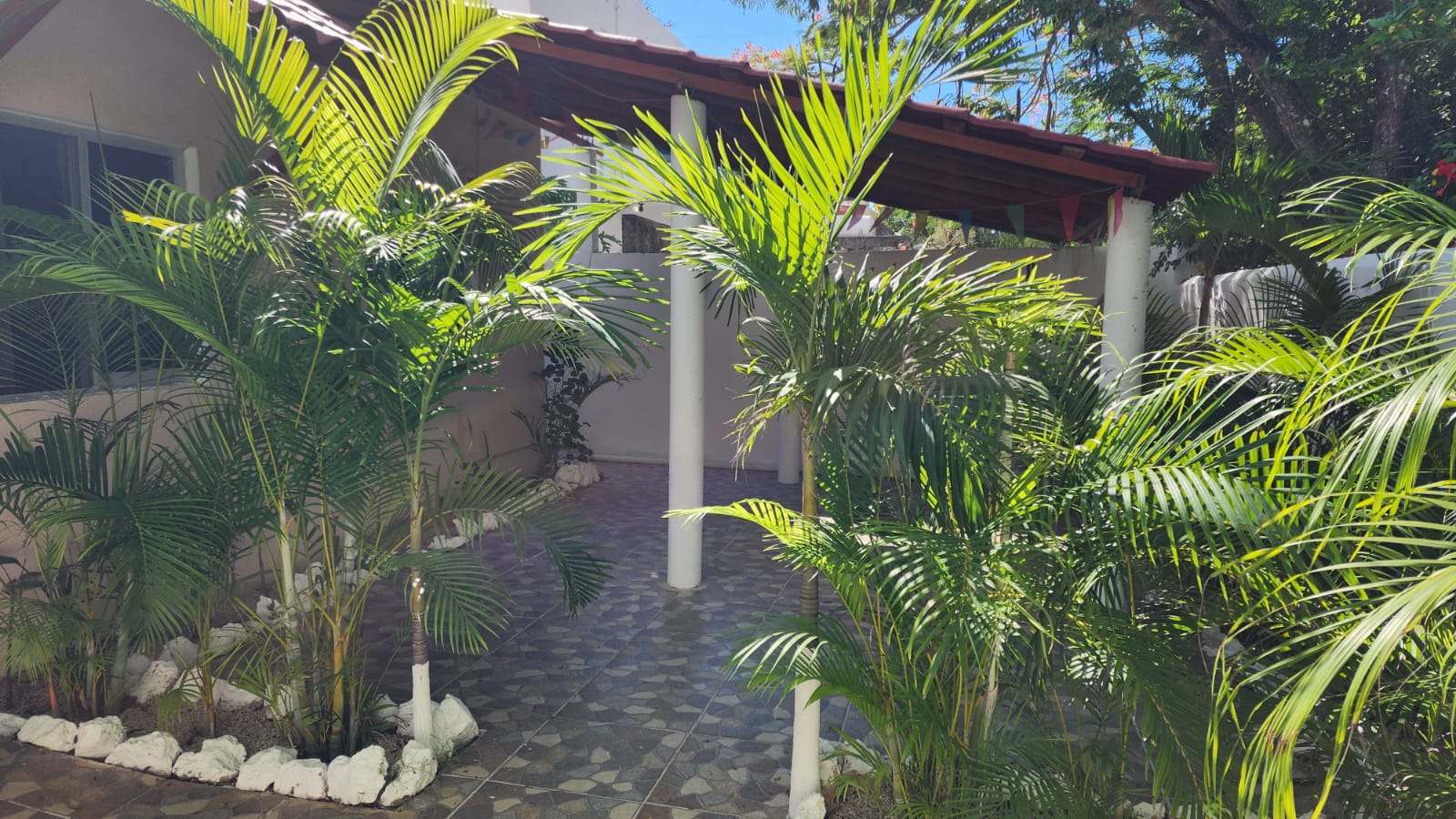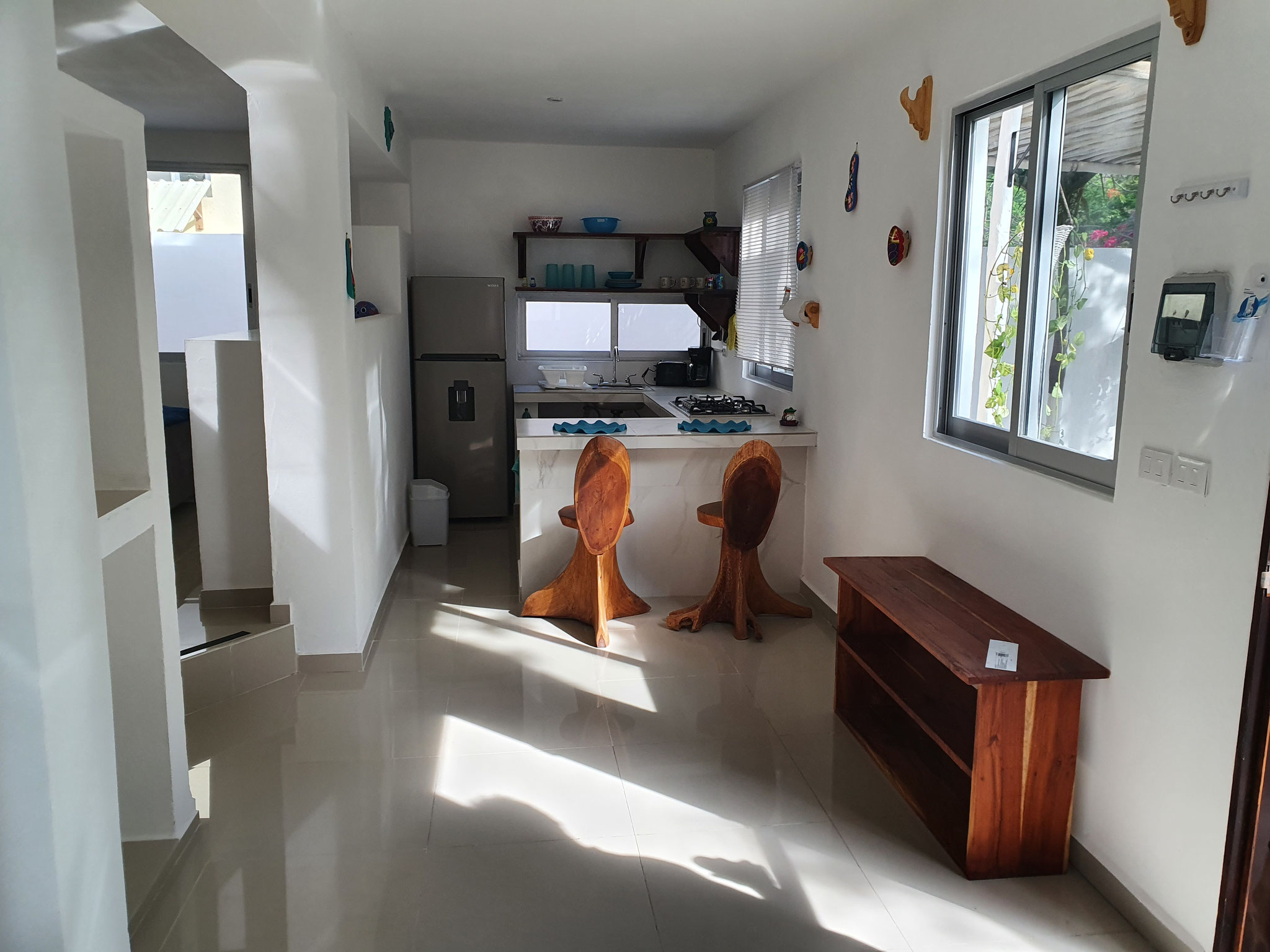 Die beiden privaten Palapa-Häuser mit rustikalem Strohdach im typisch karibischen Stil sowie das Studio-Apartment im 1. Stock und auch die Garten-Apartments liegen ruhig, inmitten auf einem privaten und abgeschlossenen Wohngebiet mit Einzelhäusern und Apartments. Viele kleine Sand-Schotterwege durch den Dschungel laden zum Spazieren gehen oder Sport treiben ein. Hier kann man ab und zu sogar kleine Äffchen, Papageien, karibische Vögel und Leguane beobachten