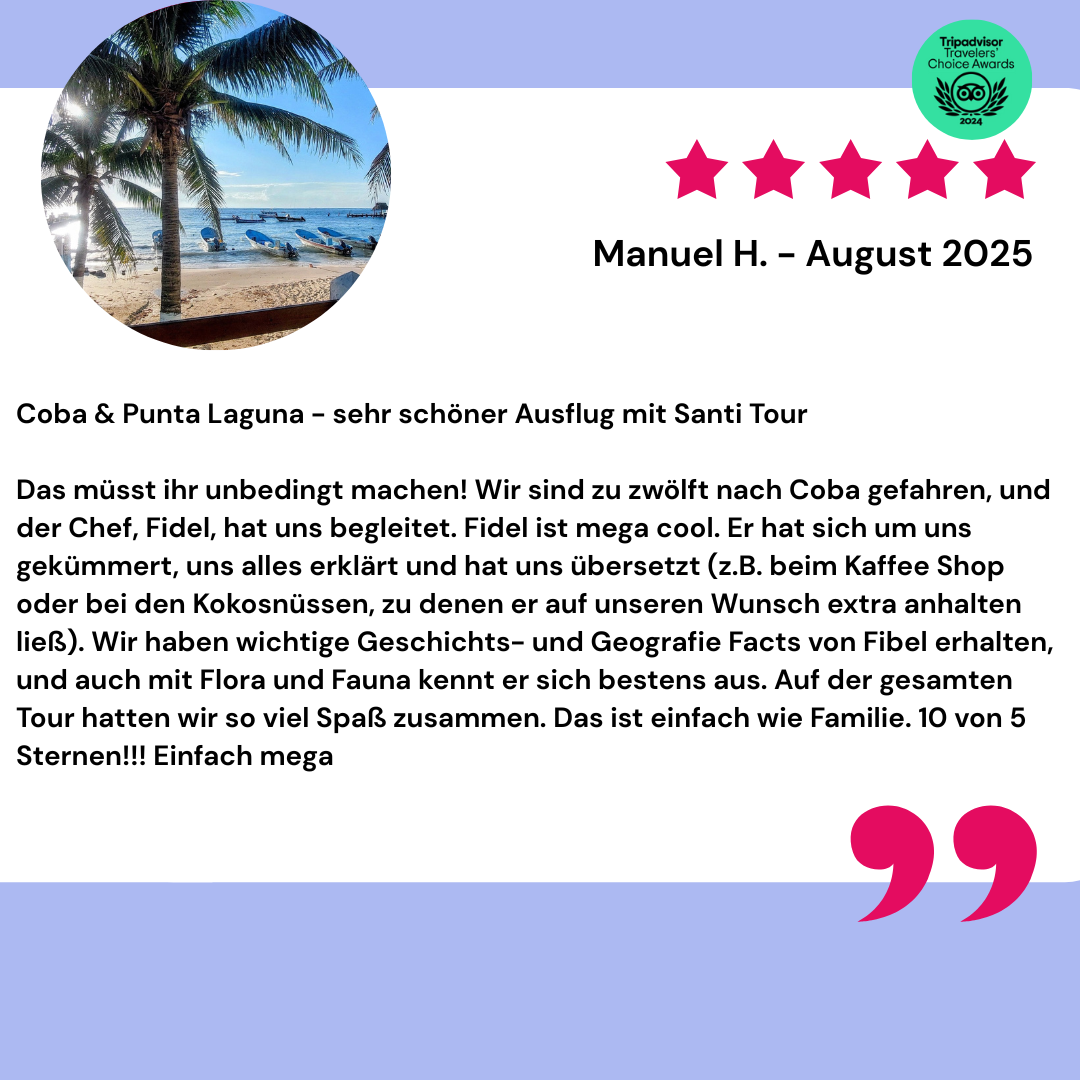Mittagessen: Im Anschluss erwartet uns ein landestypisches Buffet im Mayastil in einem gemütlichen Palapa-Restaurant. Genießt die traditionellen Speisen und den Blick über die Lagune – ein perfekter Moment, um Energie zu tanken und die Erlebnisse des Vormittags Revue passieren zu lassen.
