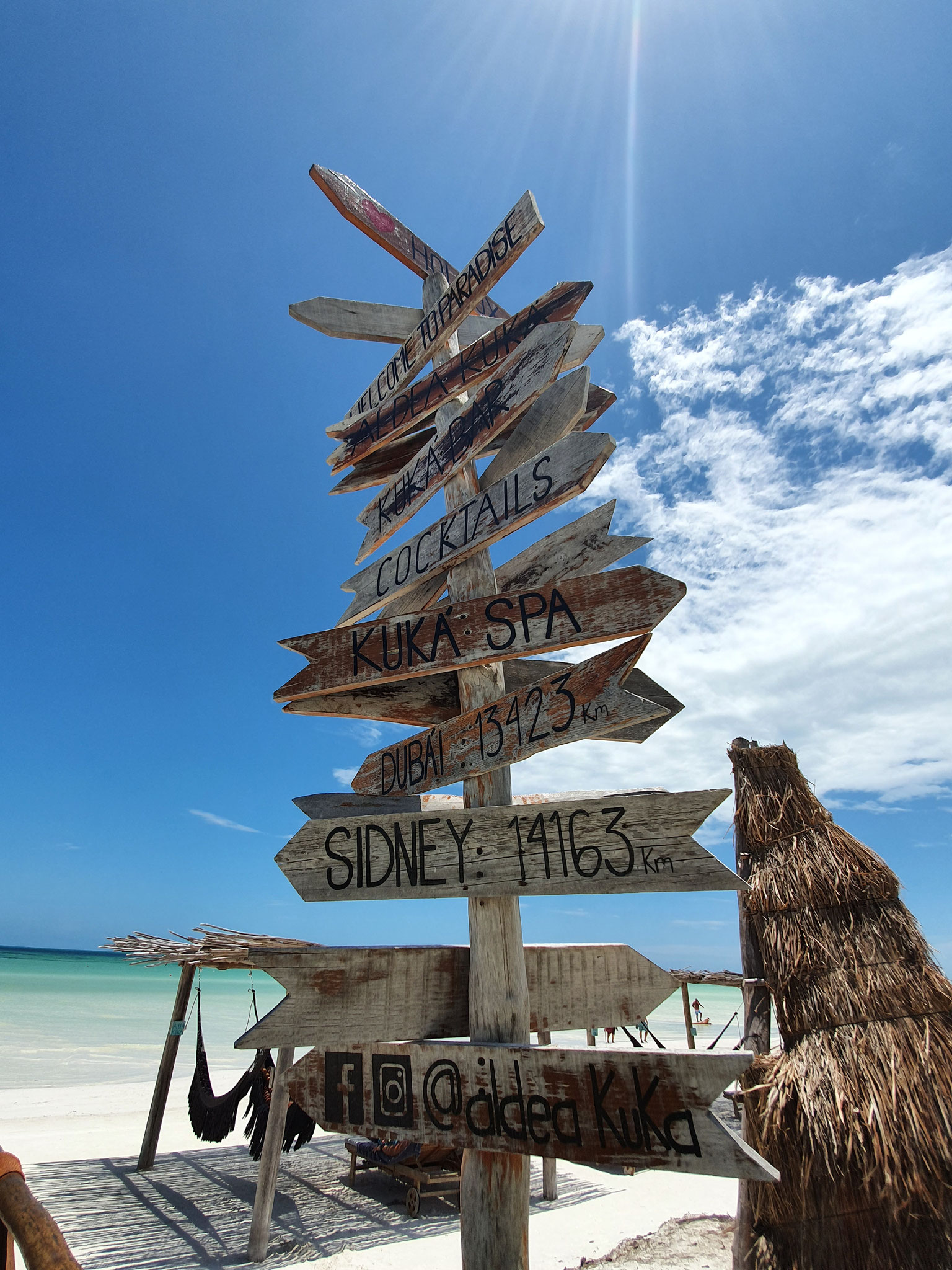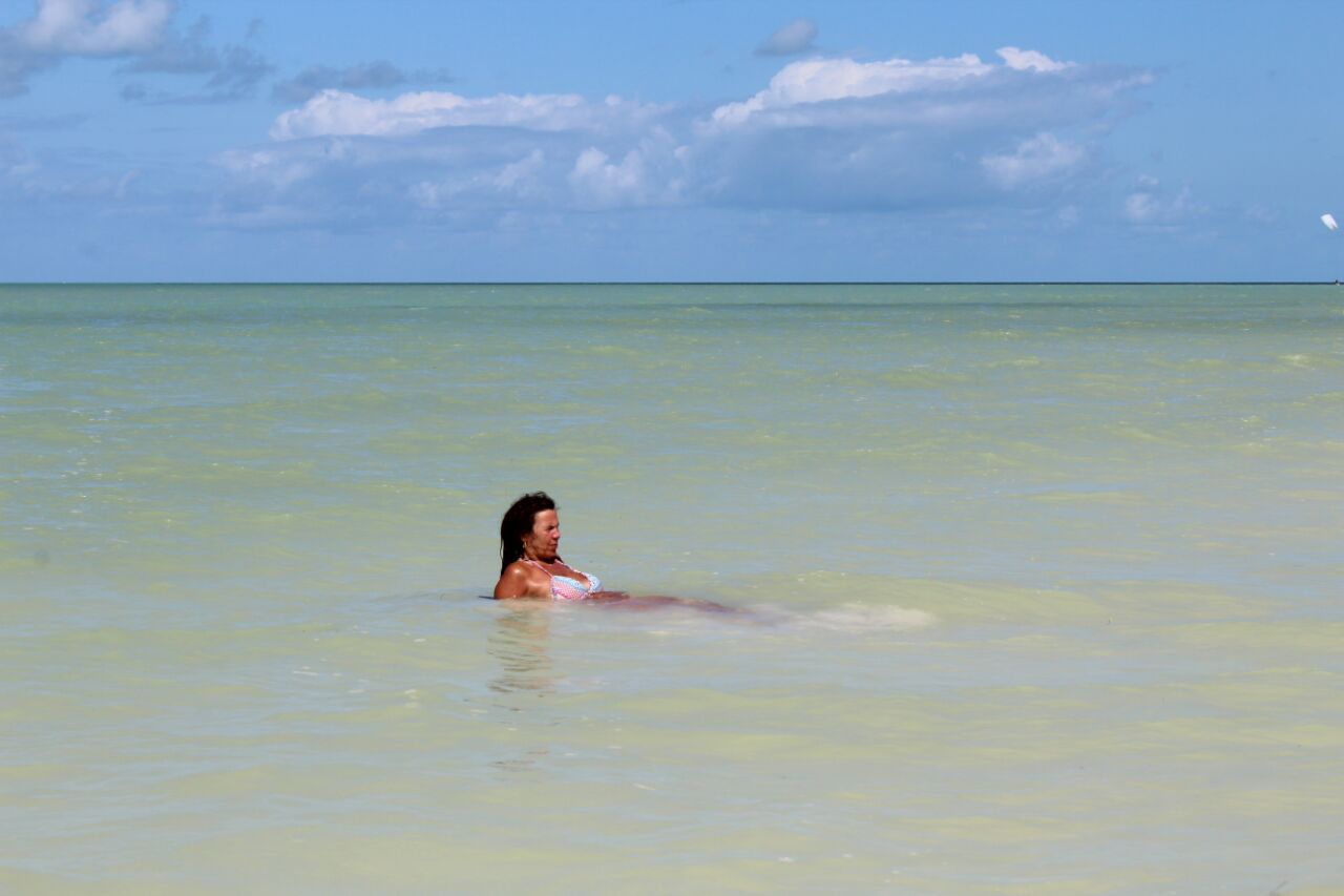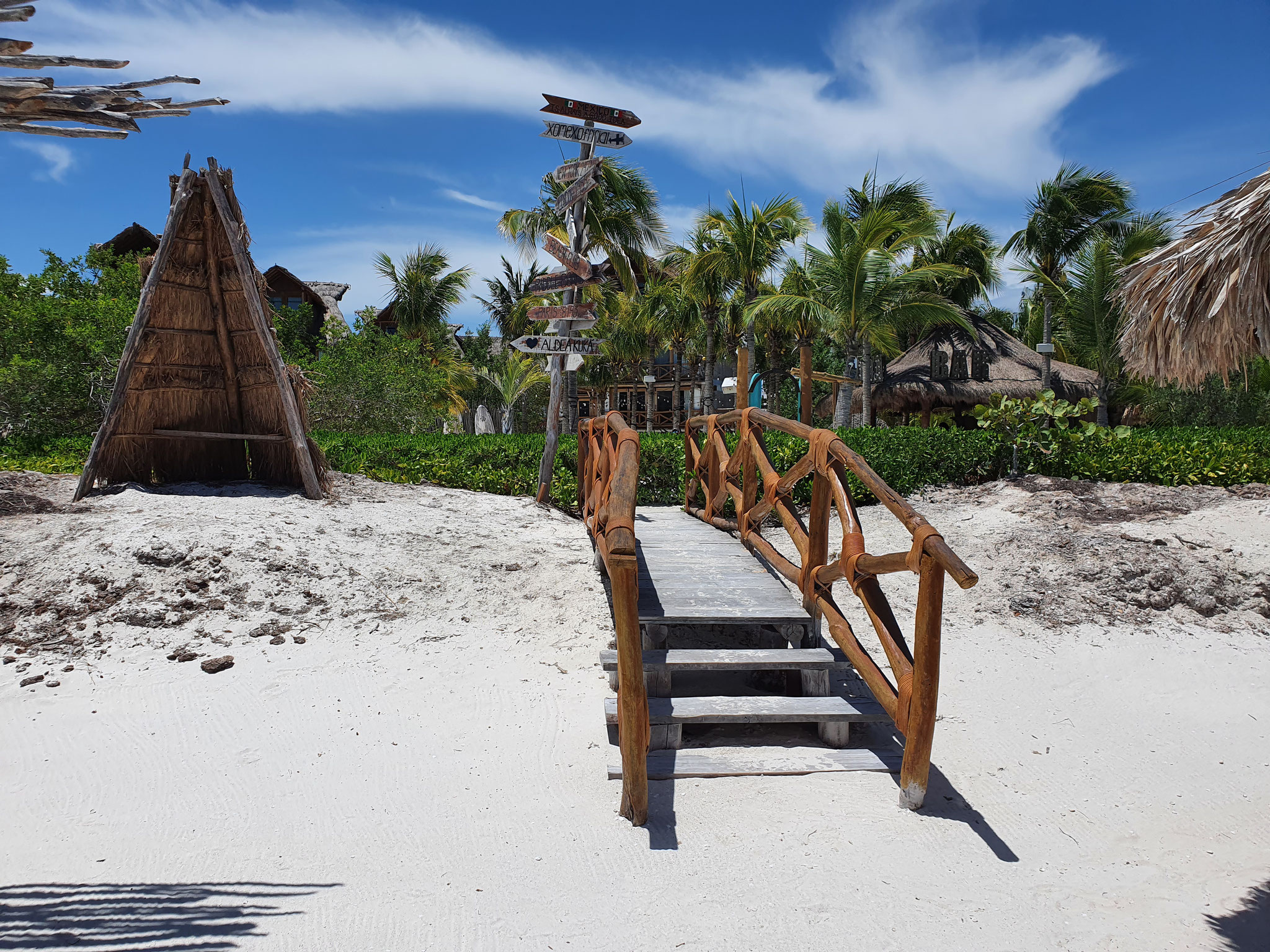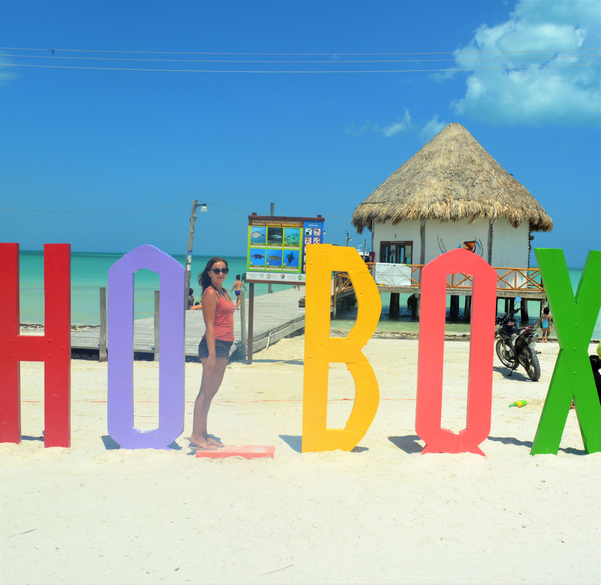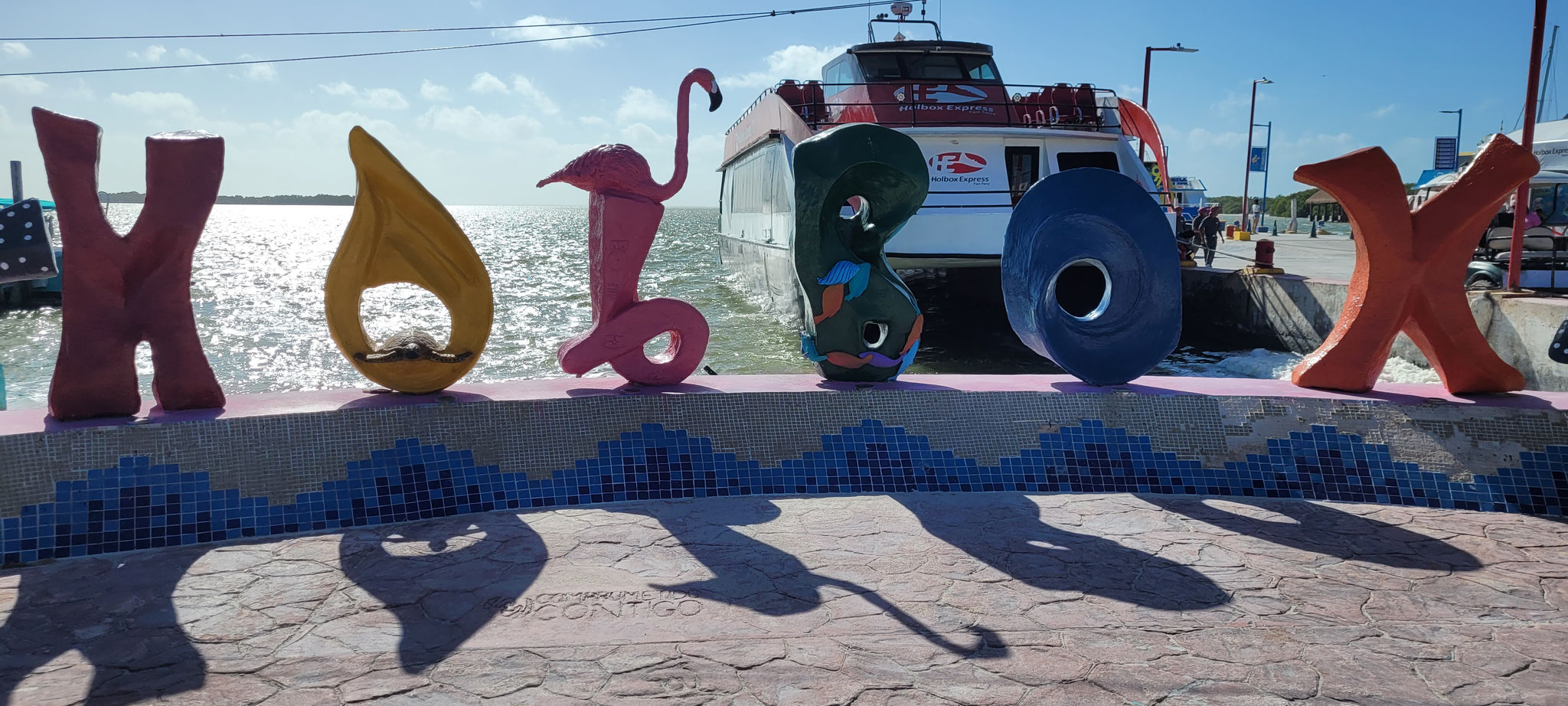 Wir erreichen die Insel früh am Morgen und nutzen die ruhige Stimmung, um die ersten Erinnerungsfotos an einem der beiden berühmten Holbox-Schilder zu schießen – ein Must-Have für jedes Fotoalbum.