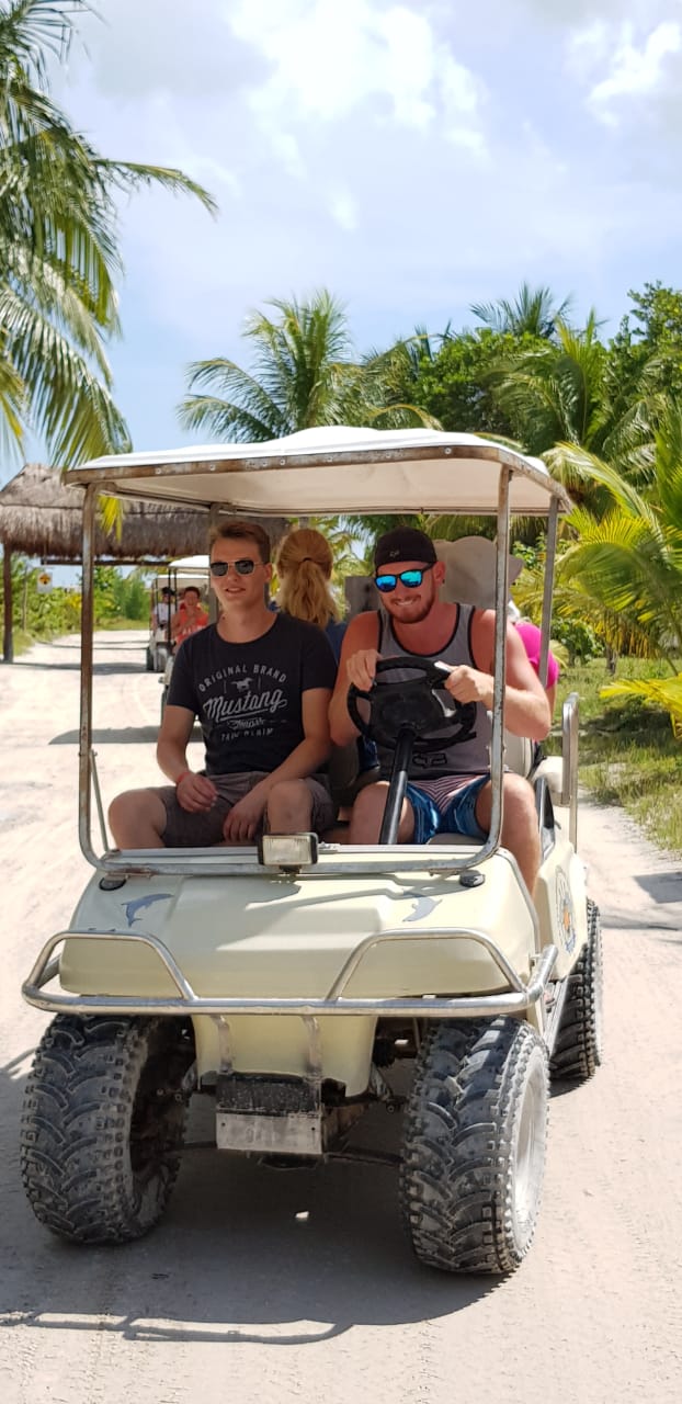 Mit dem Golfcart unterwegs: Anschließend erkunden wir die Insel auf einer Golfcart-Tour. Über karibische Sandwege geht es zu verschiedenen Aussichtspunkten, an denen wir immer wieder stoppen, um Fotos zu machen und die spektakulären Farbspiele des Meeres zu bestaunen.