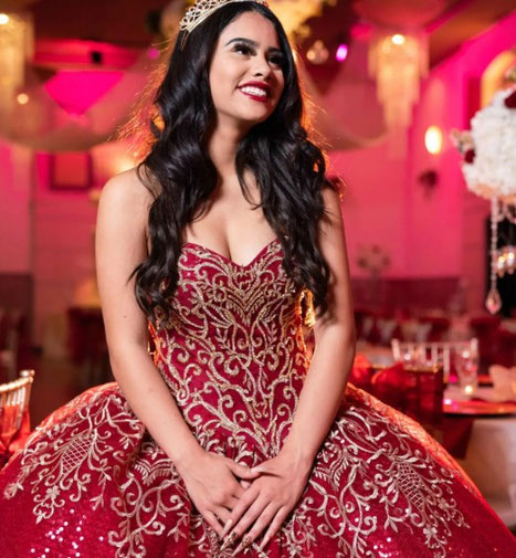 Die Quinceañera trägt ein aufwendig gestaltetes Ballkleid – meist in hellen Tönen (weiß, rosa, babyblau, manchmal auch kräftiges Rot oder Gold).